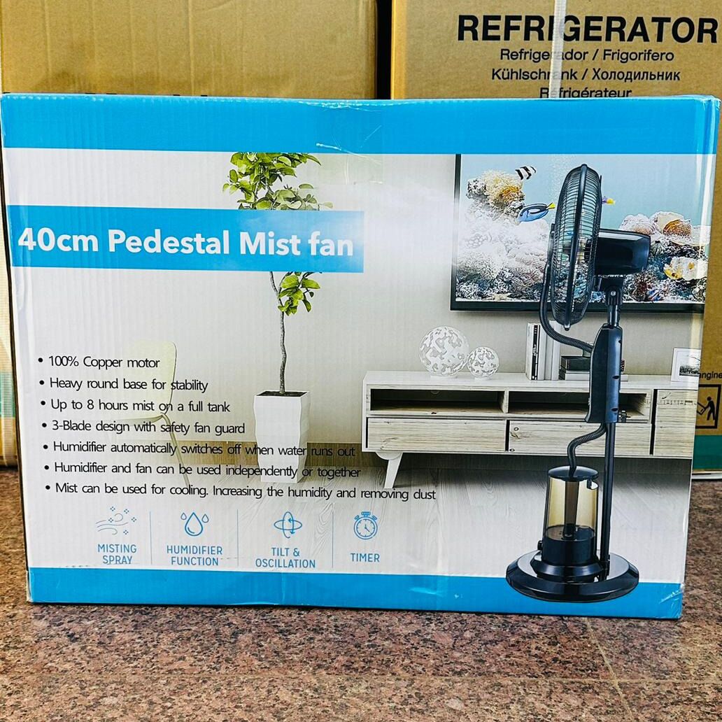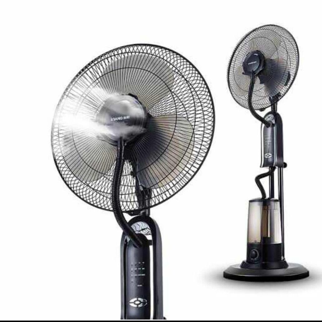 - 16 inch, 1.17 m tall, max mist volume: 300ml/h, mist volume adjustment, 3-speed wind adjustment, 7.5 hours timer setting, spraying mist and cooling, humidifying and removing dust. 5 meters remote control, swing function, tank capacity: 3.2 liters; coverage area: 20-50 sqm, voltage 100-240 V, frequency 50-60 Hz