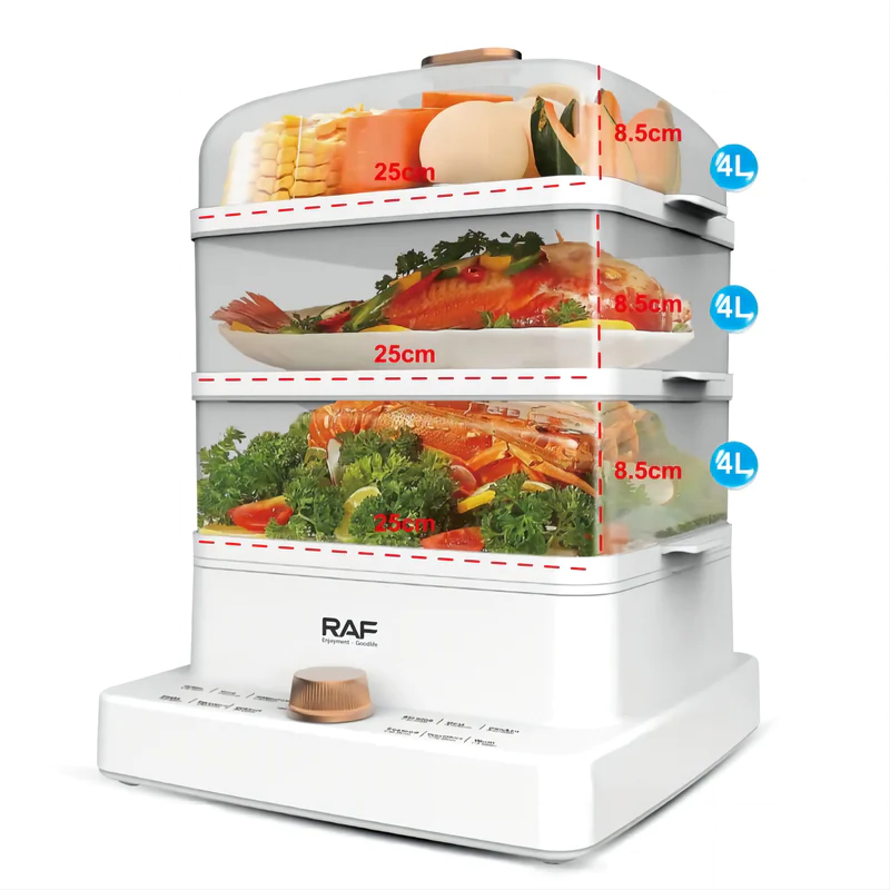RAF3-tiered food steamer of 9.5 quart combines countertop convenience with healthy options for delicious and nutritious home-cooked meals. Vegetables cook tender and crisp and fish moist and flaky. Simple, mistake-proof controls make meal prep easy and steam foods with tasty results. Food steamer cooks a wide variety of food including vegetables, seafood, meat, poultry, fruits, eggs, and grains. Requiring no oil and giving off no smoke, steaming your food leaves very little mess to clean up after you have finished. This steamer electric comes with an attractive, 800-Watt, stainless steel wrapped heating base that holds two cups of water which allows for up to 60 minutes of steaming time.